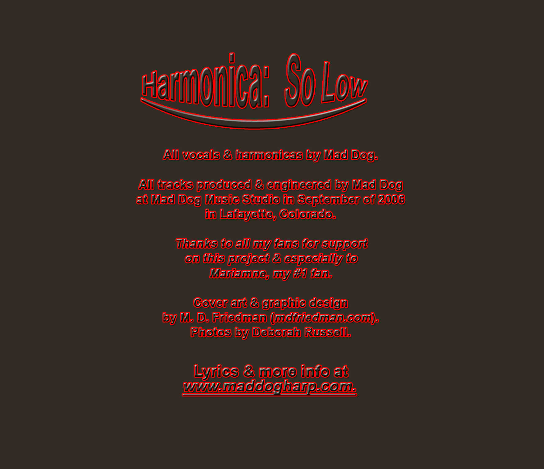 I am really pleased with how this project came out. Songs range from ones that will make you cry to ones that will make you laugh. I pulled off some shit on harp I am not sure I could do again & some tricks on the production end that are best described as beautiful accidents. "Landing" is unique cut in that it uses harmonicas with electronic manipulation to produce a trance-like state in the listener while "White Lightening"is a pure acoustic back porch harmonica blues holler with an open your heart message. The last track, "Harmonica Cadillac," is my favorite, at least to perform, and features the harmonica imitating the rhythm of an old cadillac sputtering down the highway.-- Mad Dog